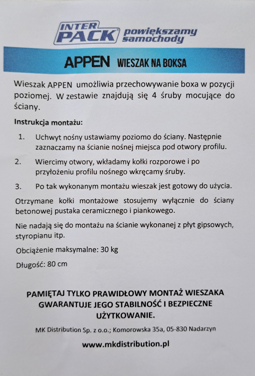 Inter Pack Appen - ścienny wieszak prosty do boxów dachowych o długości 80cm, umożliwia przechowywanie boxów w bezpiecznej pozycji poziomej. Poza boxami dachowymi można na nim przechowywać także inne produkty, np. rowery, drabiny, narty, deski surfingowe, bagażniki samochodowe, węże ogrodowe itp.
